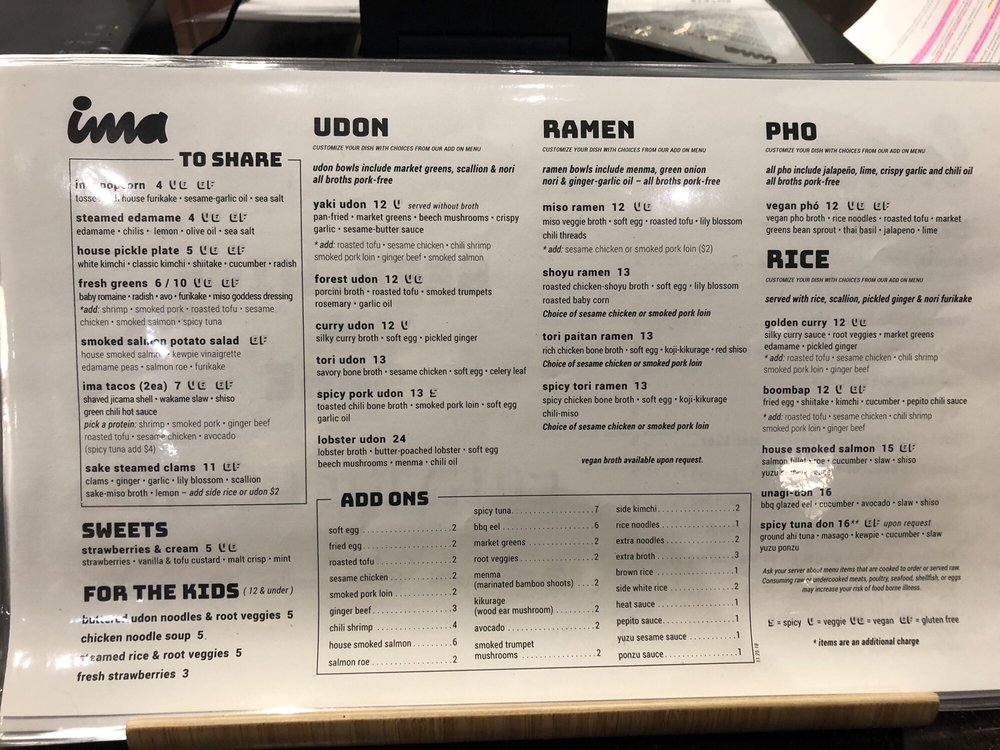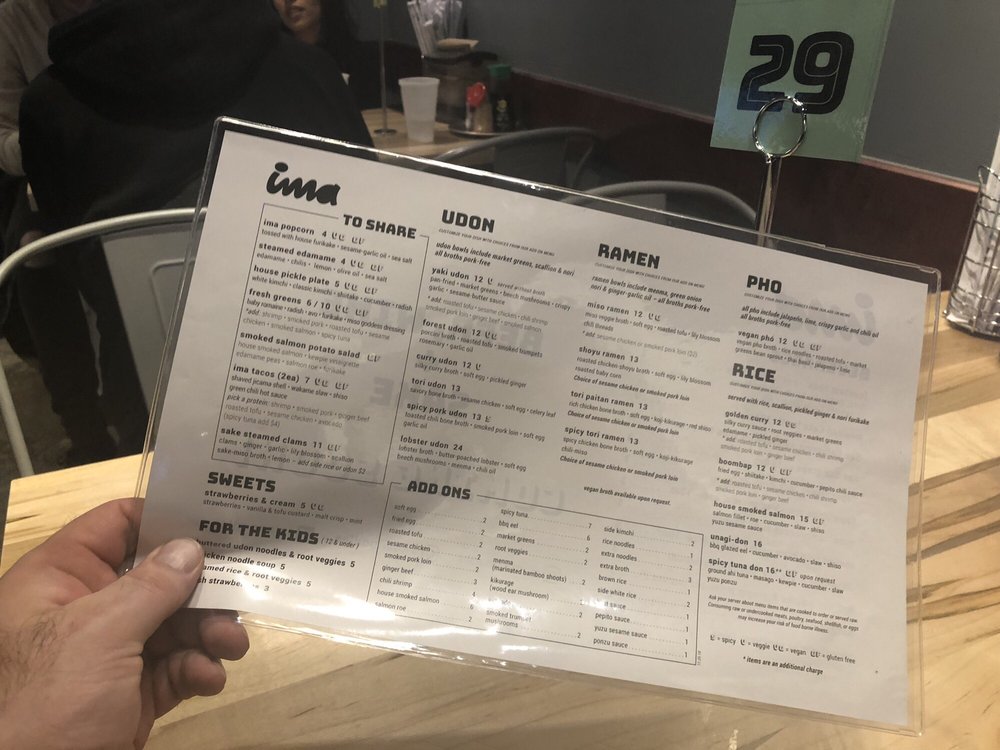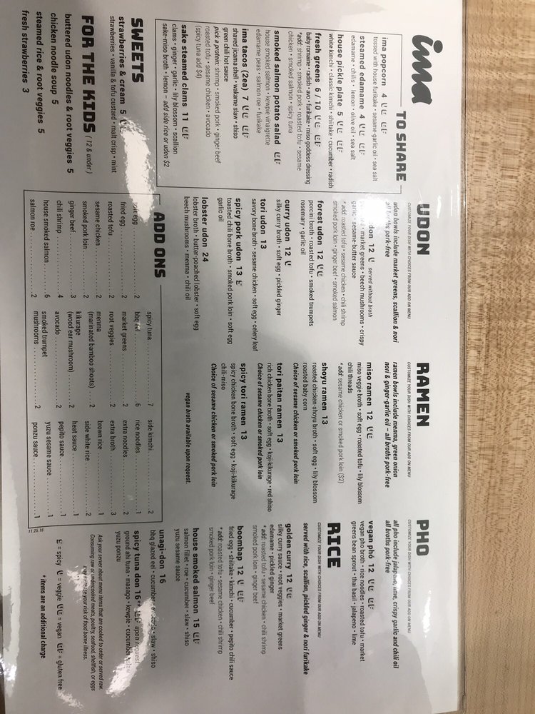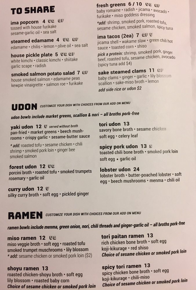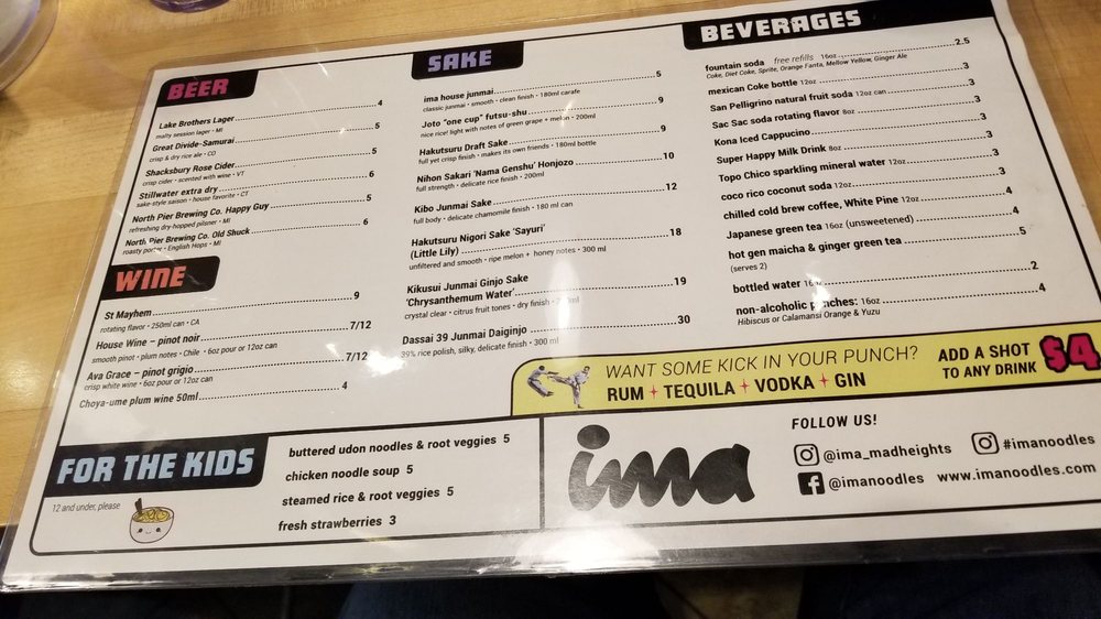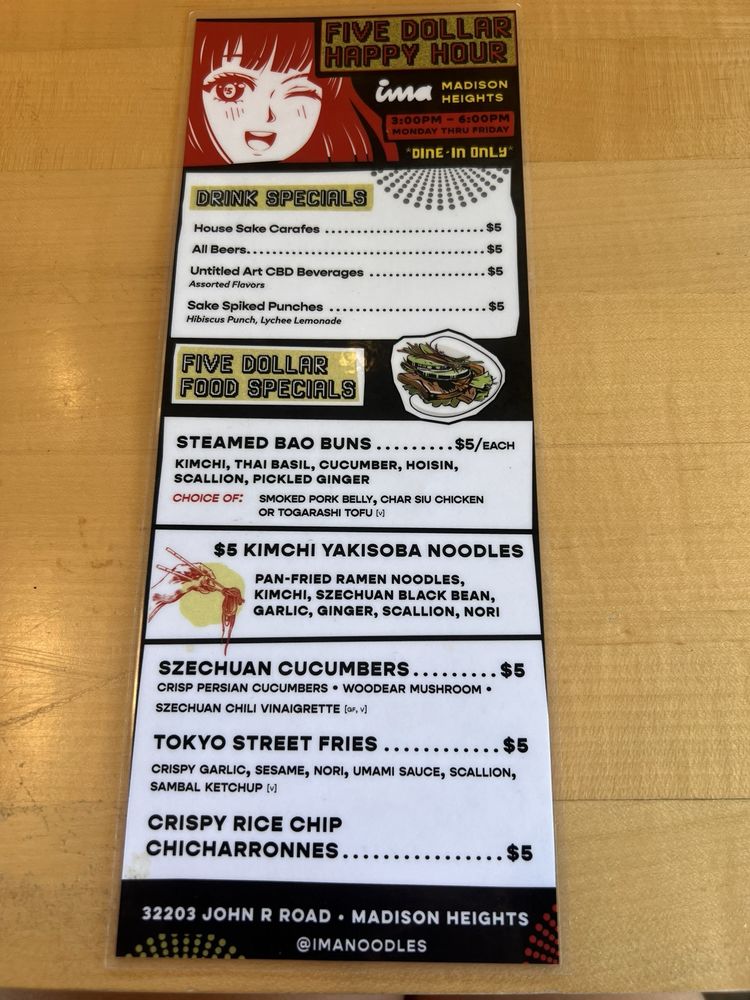 Ima is a trendy and casual restaurant located in Madison Heights, MI, offering a diverse menu with vegan and vegetarian options. The menu includes delicious items like steamed edamame, house-pickled plates, shrimp & scallion dumplings, and various udon and ramen dishes. Customers praise the flavorful broth, perfect noodle texture, and unique toppings that add depth to the dishes. With options for outdoor seating and a convenient QR code ordering system, Ima provides a pleasant dining experience. It is a go-to spot for those craving divine noodles and seeking a unique dining experience outside downtown locations. Don't miss out on their happy hour specials and the opportunity to try different broth flavors, like rich and lighter vegetable broths. Overall, Ima impresses with its variety, taste, and excellent service.
