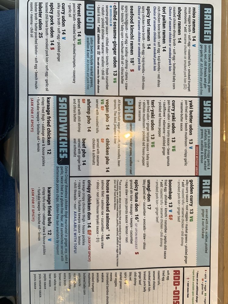 Choice of sesame chicken or smoked pork loin. Rich chicken bone broth, soft egg, red shiso, sesame garlic oil